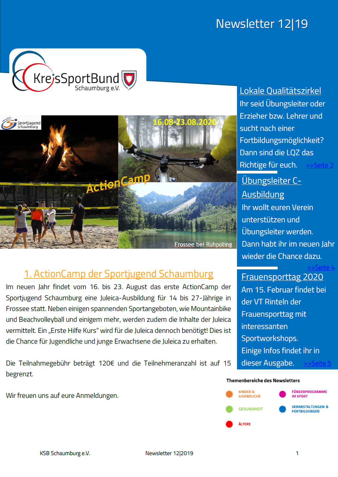 Über unseren Newsletter erhaltet ihr interessante Berichte rund um den KreisSportBund Schaumburg e.V., sowie nützliche Informationen zu Fortbildungsangeboten, Förderprogrammen und vielen weiteren Themenfeldern.